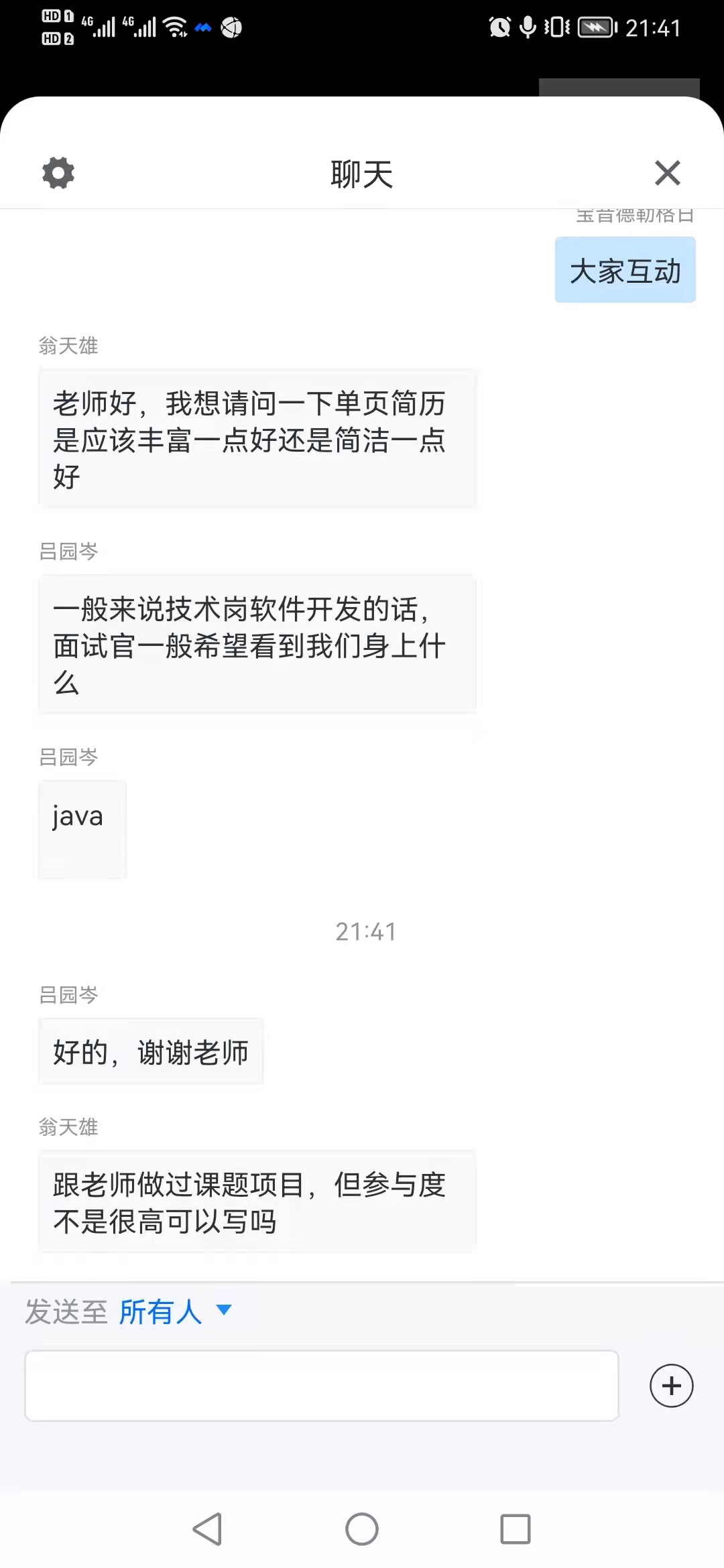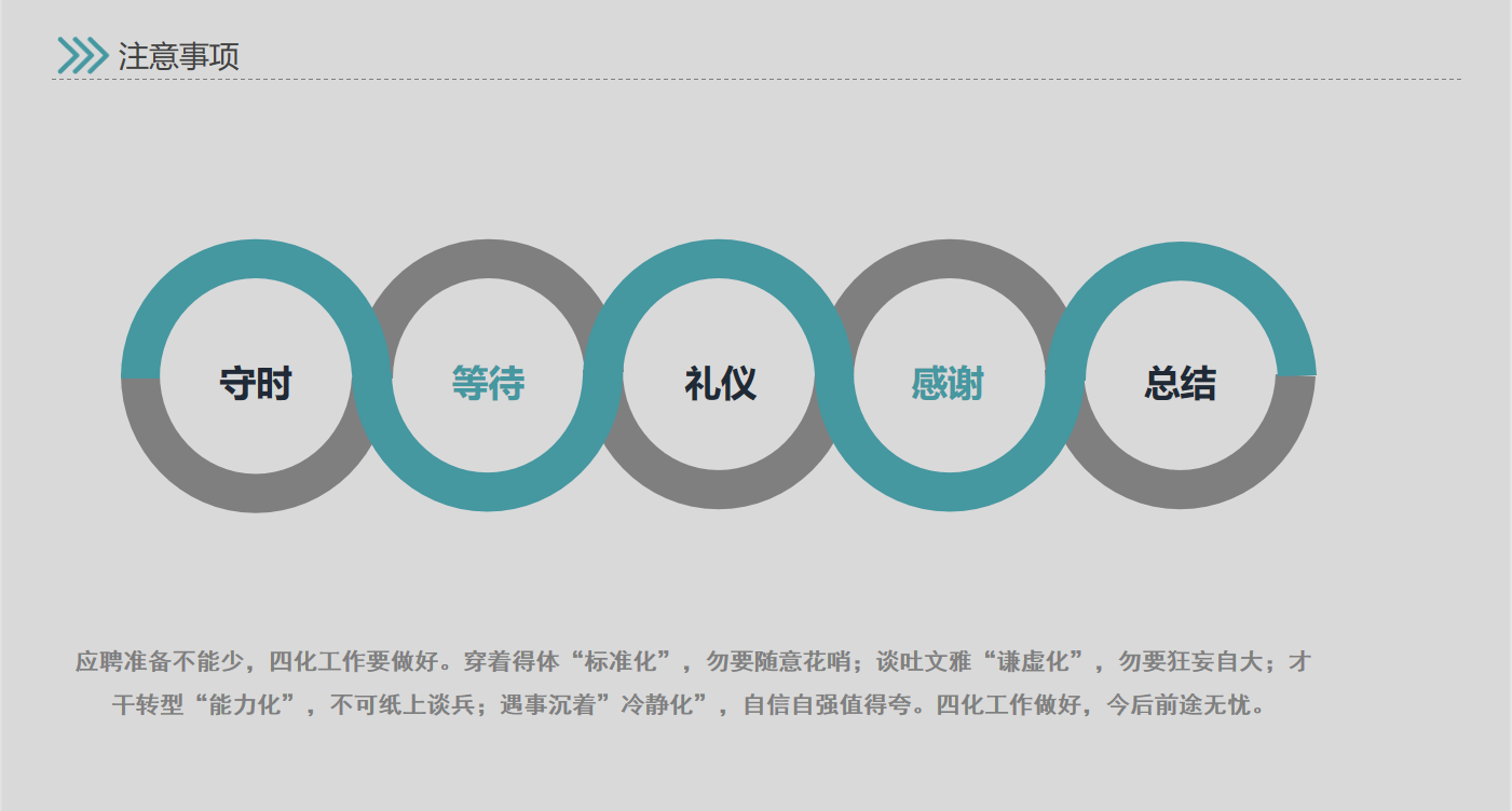 最后,程老师将求职的注意事项通过一句口诀总结给同学们:应聘准备不能少,四化工作要做好。穿着得体“标准化”,勿要随意花哨;谈吐文雅“谦虚化”,勿要狂妄自大;才干转型“能力化”,不可纸上谈兵;遇事沉着“冷静化”,自信自强值得夸。四化工作做好,今后前途无忧。