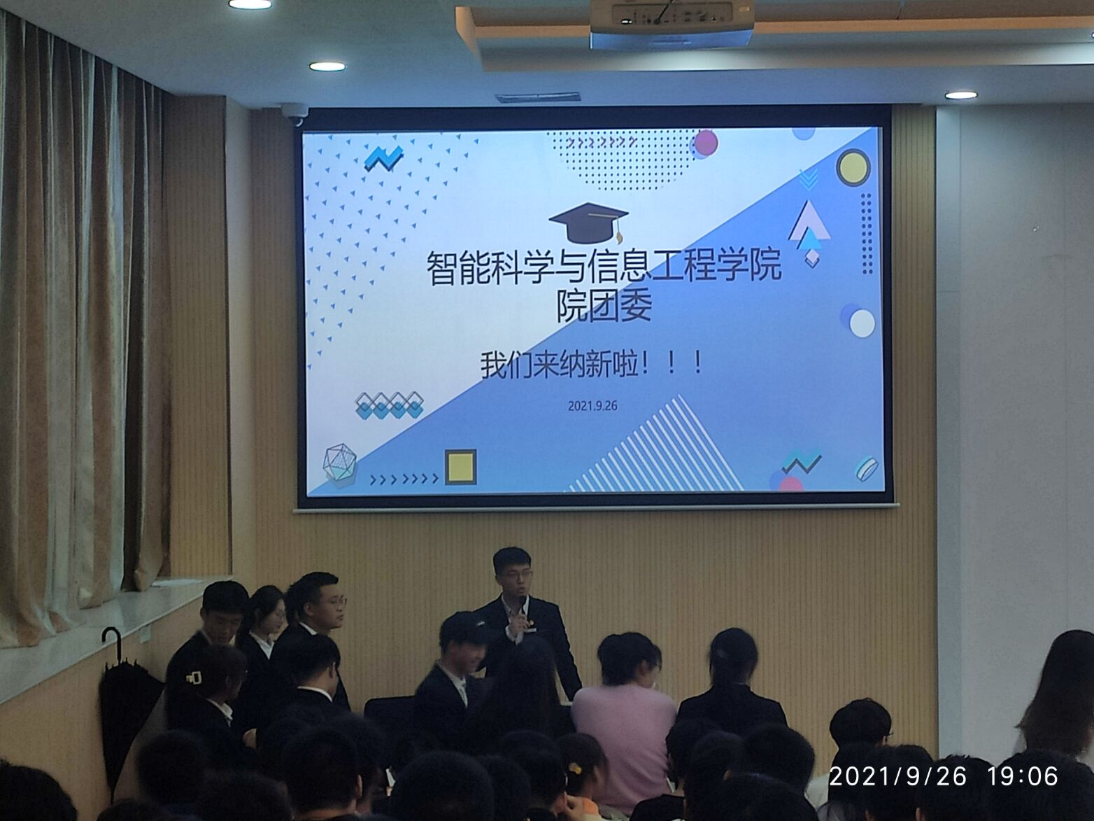 为更好服务学生群体,宣传我院团学组织,为我院团委新一年的工作注入新鲜血液,智能科学与信息工程学院团委面向我院所有大一新生,于9月26日在育英楼3502及3507教室开展了“我值年少,书生意气”团委纳新宣讲会。我院团委书记郭瑀凡老师,团委副书记沈天宇及团委各部门全体委员参加了本次纳新宣讲会。