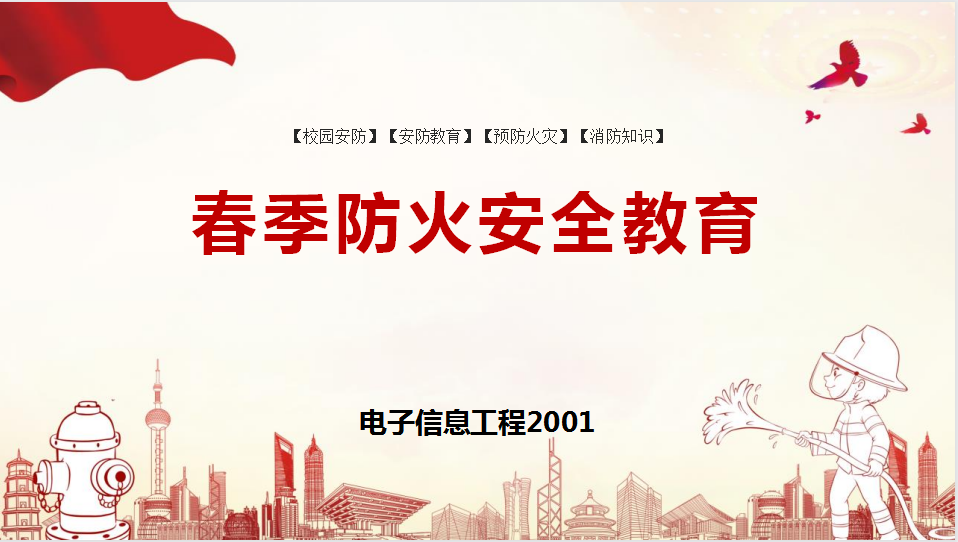 电子信息工程2001班在开展“春季防火安全教育”时,团支书王一体同学通过PPT展示、防火安全短视频等方式,与大家共同学习和交流了春季校园防火及应急应对措施、宿舍火灾安全隐患及自我救护、灭火器的选择及使用方法等防火安全基础知识。