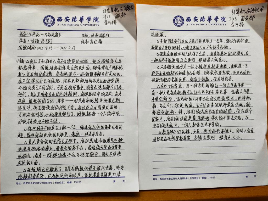 书香助力战“疫”,阅读点亮人生。疫情防控期间,为扎实学风建设工作,深入推进全民阅读常态化,鼓励学生以书会友、以才交友,塑造内涵丰富、特色鲜明、品味高雅的校园文化,倡导同学们弘扬传统文化,坚定文化自信,成为新时代的新青年。智能科学与信息工程学院学生会于2022年4月22日至4月30日举办为期8天的“阅读洗涤青年心,青春致敬强国梦”——寻找最美读书笔记活动。