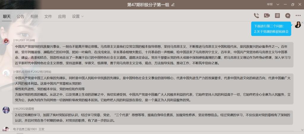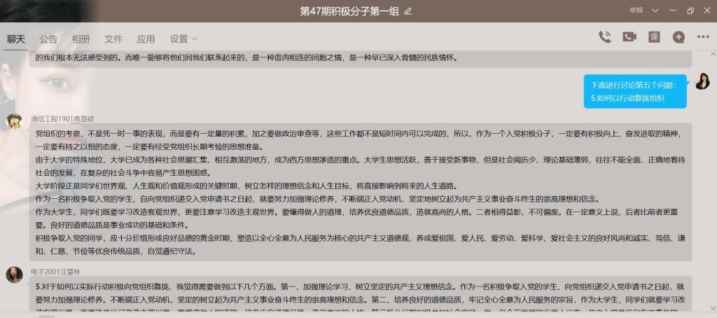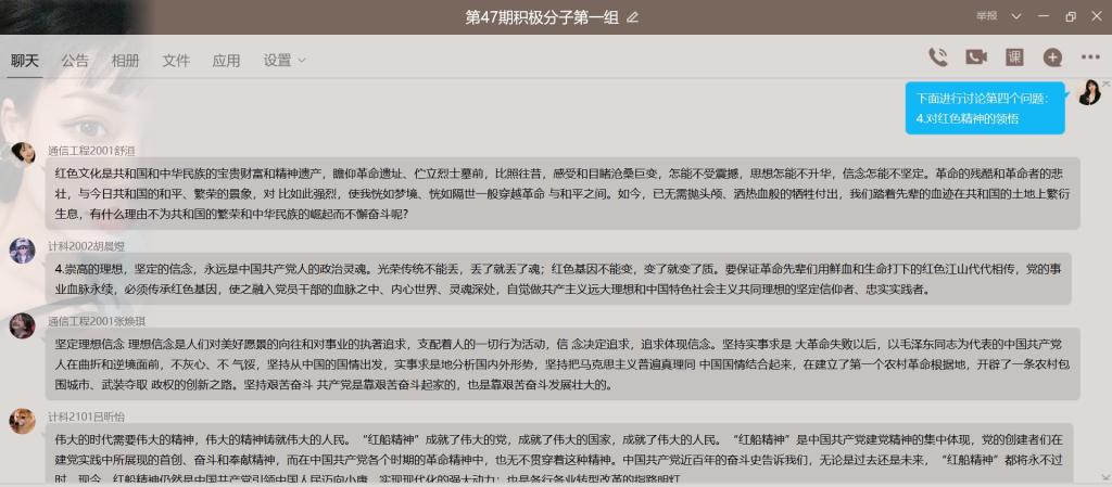 5月5日本期入党积极分子通过QQ群聊,围绕“为什么入党”、“关于党课的收获和体会”、“《建党伟业》观后感”、“对红色精神的领悟”、“如何以行动靠拢党组织”这五个问题进行交流与讨论,每位学员都积极参与讨论,发表感想。