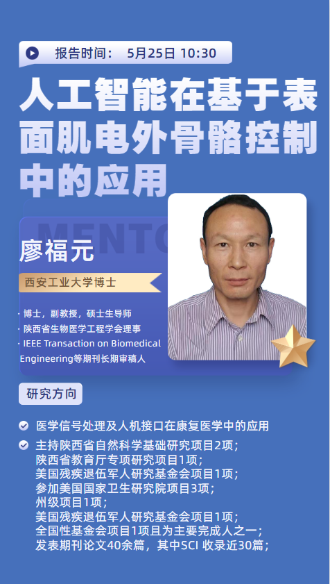 2022年5月25日,应我院邀请西安工业大学廖福元副教授在我院作了题为《人工智能在基于表面肌电外骨骼控制中的应用》的讲座,此次讲座是智能科学与信息工程学院“人工智能”系列讲座的第一场。