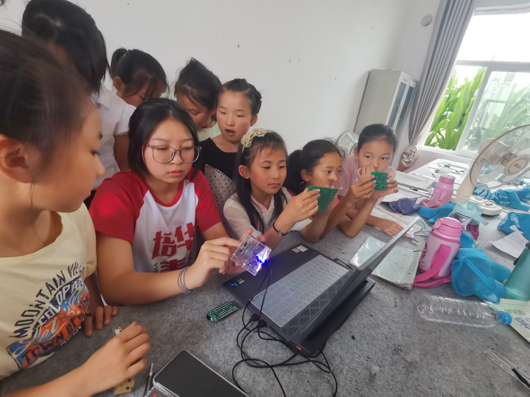 7月11日上午,志愿者利用专业学科知识为孩子们开展电子知识科普小课堂,其包括物联网时钟、智能小车、自制小音响等科技产品,吸引着孩子们的眼球,他们纷纷围上前来,脸上充满了疑惑,认真听志愿者讲解自制智能小车和充满神秘色彩的物联网时钟,通过自己动手、完成组装,小车在自己操控下动起来的那一瞬间,成功的喜悦溢满心灵;炫酷的物联网时钟,孩子们轻轻按下开关,屏幕上显示出带有多种颜色的网络同步时钟。