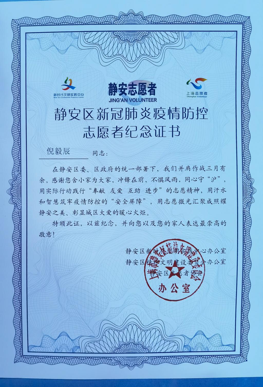 倪毅辰,男,入党积极分子,通信工程1901班学生,2022年3月起在上海市静安区三泉路居委会隔离点工作。2022年的3月,上海疫情来势汹汹,被迫按下了暂停键。作为上海籍的学生,倪毅辰同学身处疫情严重的静安区,眼见每日辛勤奔波的社区疫情防控工作者没日没夜的承担着艰巨的工作任务,他毅然主动加入小区志愿者队伍。第一次穿上防护服化身为“大白”的那一刻,他怀着激动的心情解锁了自己的新身份——防疫志愿者。此后的五十多天,从未缺席每天的志愿工作。不知从什么时候起,志愿者微信工作群此起彼伏的响声已成为他每天清晨独特的叫醒方式。从完成每天的全小区人员核酸采样,从搬运物资到每户上楼派送物资,从每户统计信息到关照孤寡老人,感受到什么是初心使命,什么是责任担当,没有从天而降的英雄,只有挺身而出的凡人。如果说促使他参加到这场战役中的动力来自于党的培育,那么让他坚持下去的力量,则是小区居民们日渐舒展的笑脸。他深知,唯有怀着必胜的信念,团结起来,才能携手打赢这一仗,让亲人无恙,生活如常。