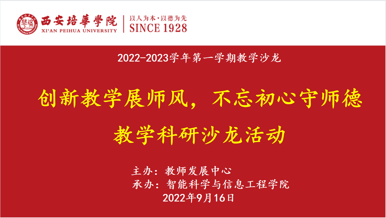 为全面贯彻落实习近平总书记关于全国教育大会精神和全面落实新时代全国高等学校本科教育工作会议精神,不断提升我校教师思想政治素质、职业道德水平、教学科研能力,落实立德树人根本任务,聚焦教学创新、引导教师潜心教书育人,2022年9月16日,由教师发展中心主办,智能科学与信息工程学院承办的以“创新教学展师风,不忘初心守师德”为主题的教学科研沙龙活动如期举行。
