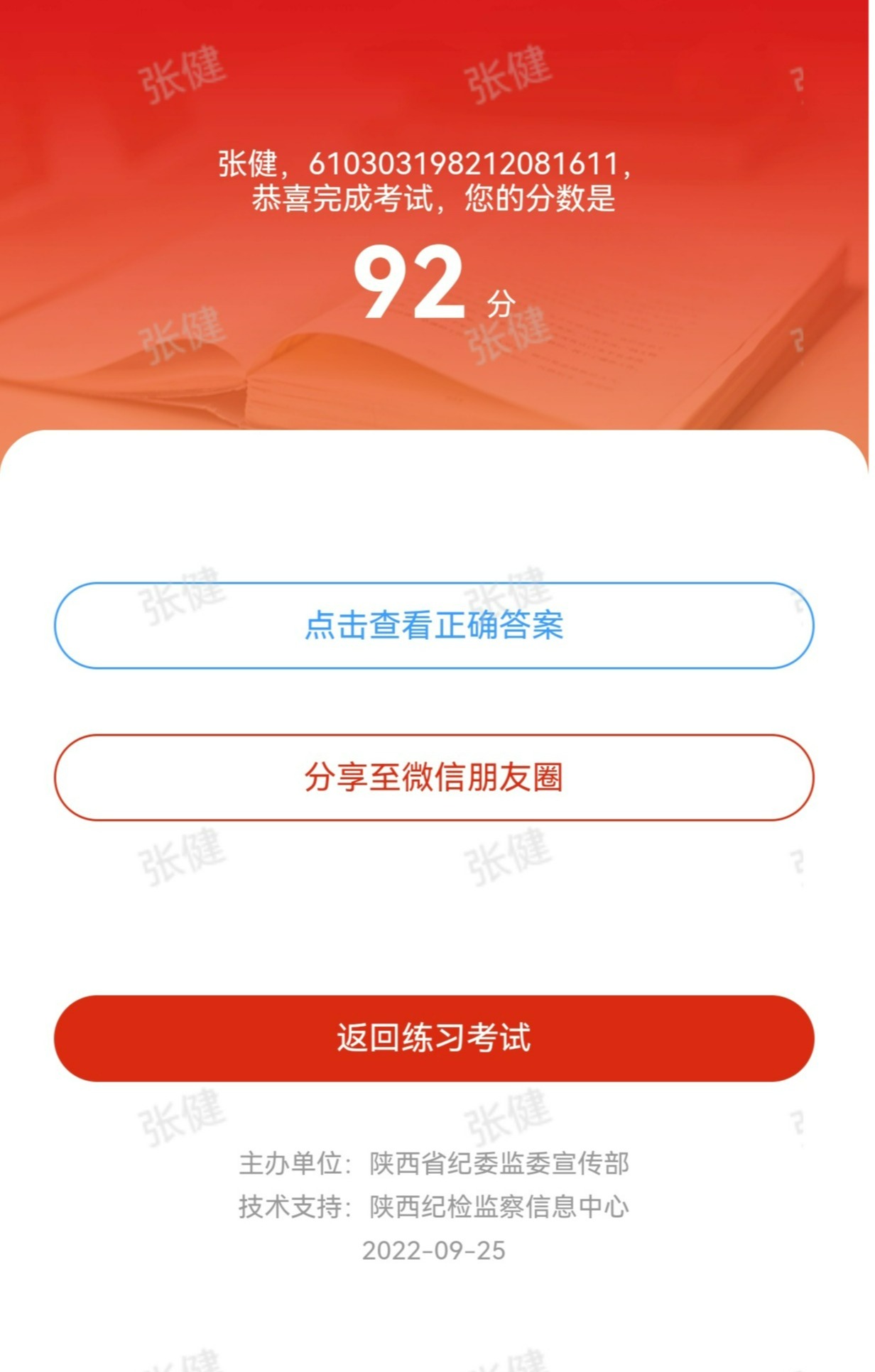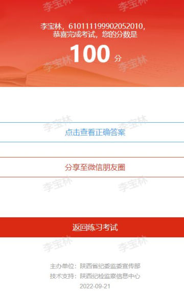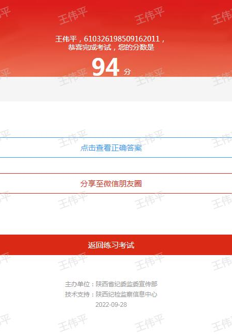 学院135名党员在“陕西纪检监察”微信公众号“全省纪律教育学习宣传月党规党纪知识测试”栏目进行在线知识测试,参测率100%,及格率100%,达到了以考促学、以学促廉,不断增强纪律规矩意识,筑牢思想道德防线的学习目的。