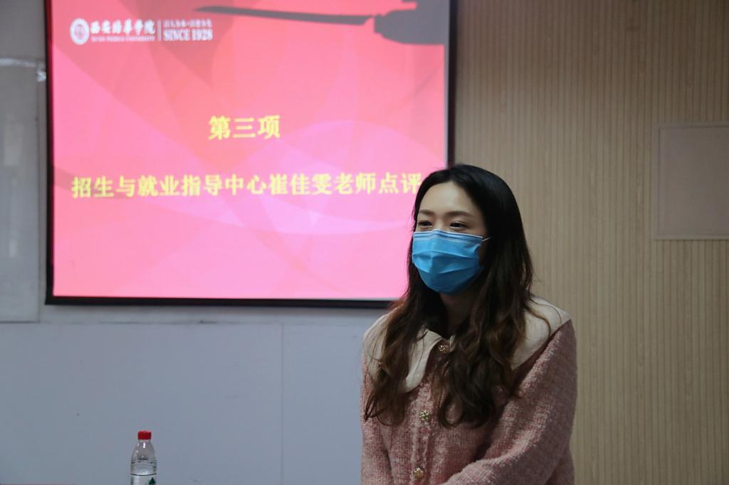 招生与就业指导中心就业办公室主管崔佳雯老师点评到:授人以鱼不如授人以渔,名花有主求职大赛我们既要授人以鱼又要授之以渔,学校给到大家这样的平台,小马过河水深水浅,需要自己去尝试。今天参赛的同学都非常重视这个事情,相信只要你参与进来,也就知道水深水浅,给自己目前一个合适的定位,明确自己的差距,只要用心去付出,一定会有自己的收获。希望大家面对事情既然要做,就要去做好,只有这样才会有收获、有成长。