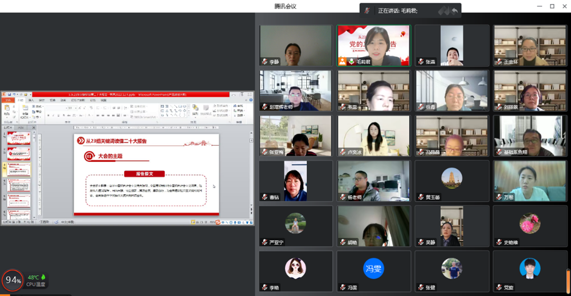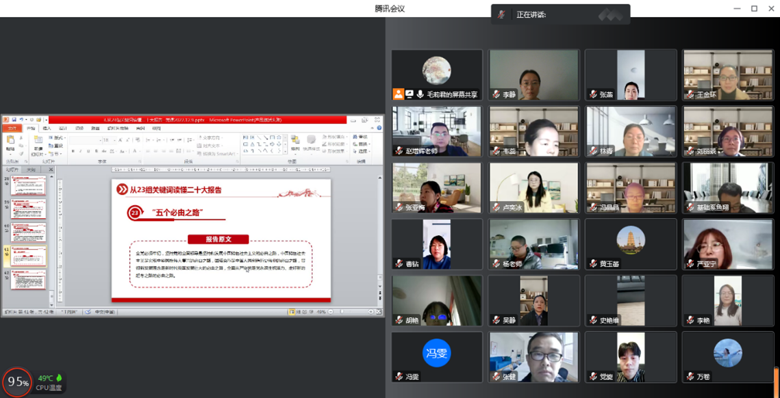 本次党课以线上会议方式开展,毛莉君老师带领大家认真学习了二十大报告中出现的“大会的主题”、“新时代十年的伟大变革”、“极不寻常、极不平凡的五年”、“三件大事”、“马克思主义中国化时代化新境界”等二十三组关键词,教工党员们认真听讲,细细体会,学习氛围浓厚。