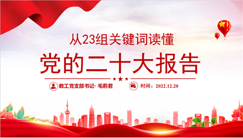 10月16日,中国共产党第二十次全国代表大会开幕,习近平代表第十九届中央委员会向大会作报告。为了使广大教工党员能够更加深入地读懂党的二十大报告,本次党课针对二十大报告中出现的二十三组关键词,进行了详细的解读。