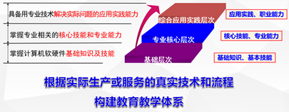 本专业紧密结合计算机技术的最新发展趋势和方向,结合产业需求及就业需要,引入行业企业专家参与研讨及论证人才培养方案。结合应用能力培养的三个目标层次(基础知识及基本技能—>核心技能及专业能力—>应用实践能力及职业能力),遵循CDIO工程教育理念及新工科建设的内涵,以工作任务、真实项目为驱动,基于实际生产或服务的真实技术和流程构建本专业的教学体系、知识结构体系及课程体系。面向计算机专业新工科人才培养,突出应用及工程实践能力训练。