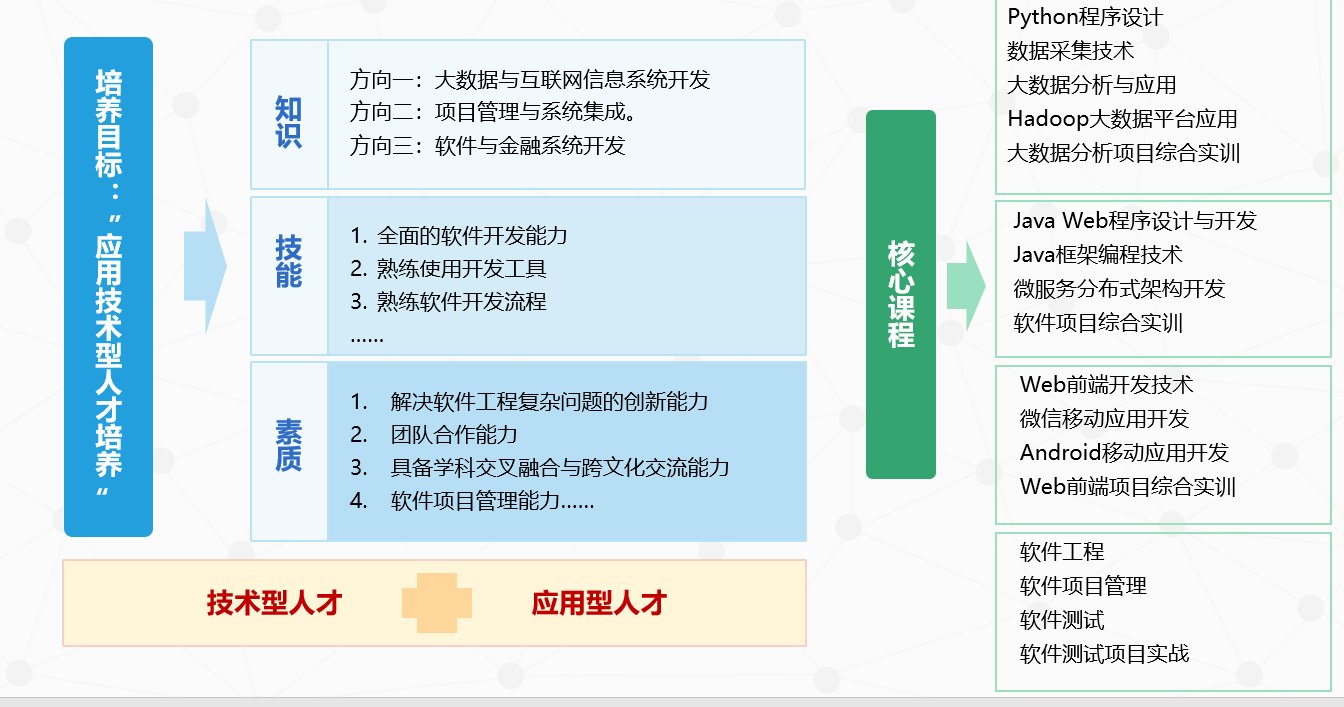 本专业采用基于CDIO工程教育理念的人才培养模式,以行业和产业需求为目标,以工程应用技术为培养方向,以Java企业级应用开发和大数据应用开发为主导,形成基于大规模软件开发的工程技术基本理论和基础知识为核心的专业办学特色。