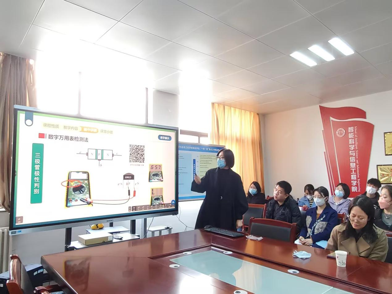 主题活动期间,开展了思政课程示范观摩活动,邢静老师的“三极管的工作原理”,从三极管的结构、特性出发,通过动画方式展示了一节生动的示范课,邢老师详细介绍了本课程的教学设计思路以及课程中的思政元素设计,对于课程思政是融于教学逻辑而不是教学语言是一种很好的示范。