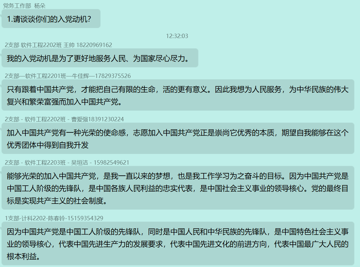 学员们在QQ群中围绕“谈谈你们的入党动机、谈谈对红色精神的领悟”等问题展开激烈讨论,发表自己的观点、看法及感想。