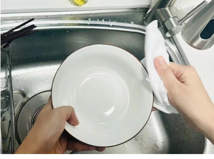 在洗完时,厨房水槽、水龙头周边用完要擦干。水槽中的水滴残留时水垢或清洁剂残渣,这些物质干了以后会留下白色污痕。去除水槽污痕的方法:洗完餐具后用残留的洗洁精泡沫的海绵清洗水槽、水龙头及周边,然后用干纸巾擦干水分。