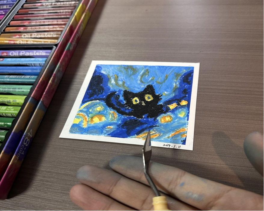 出于对美术的热爱,接触了从未接触过的油画棒,因为其丰富的色彩和可塑性极强的特性,我在第一次绘画就感觉很不错,给人一种很可爱很清新的感觉,灵感来自梵高的《星空》加上俏皮的小猫,给人一种很和善很神奇的感觉。