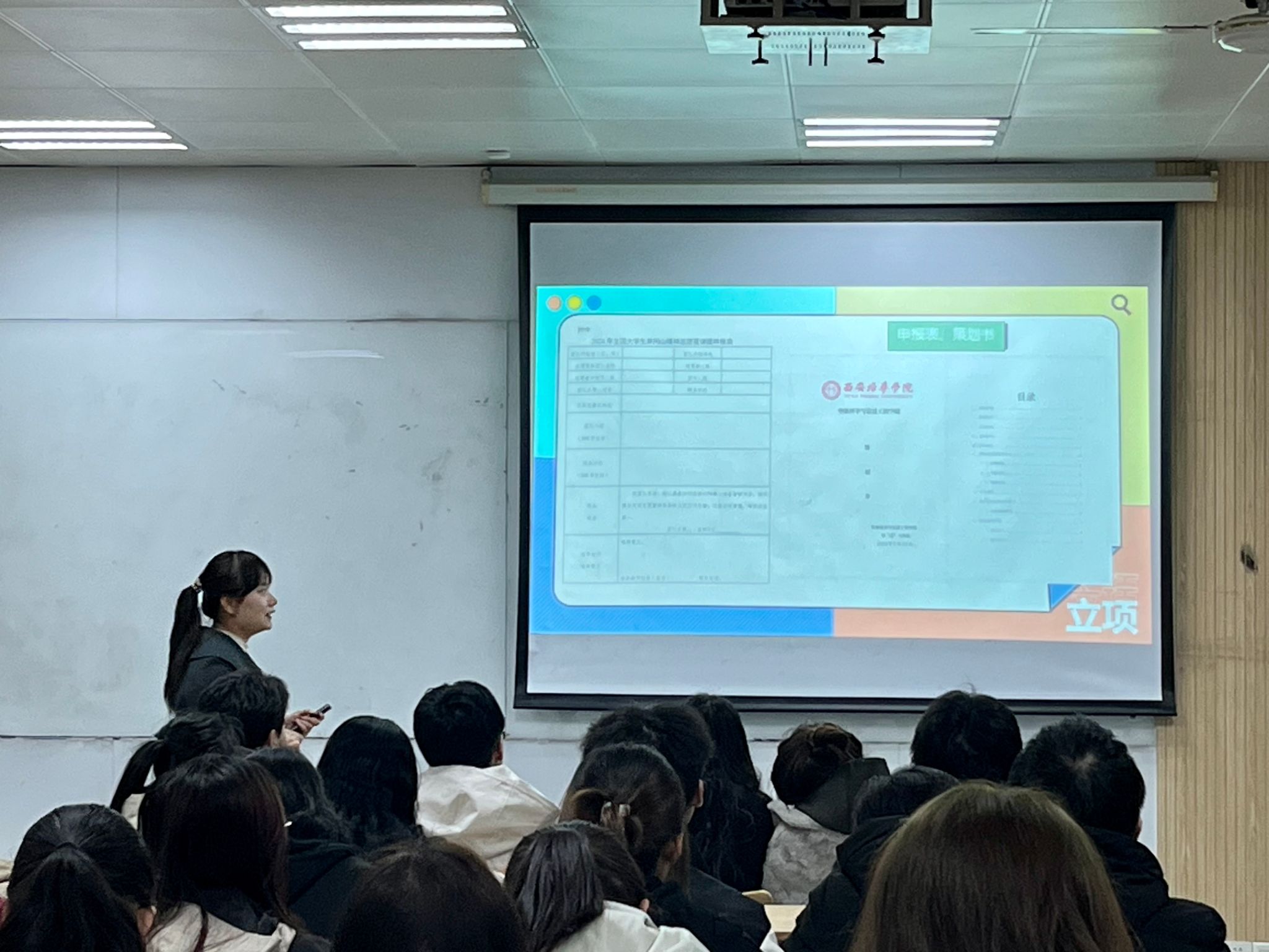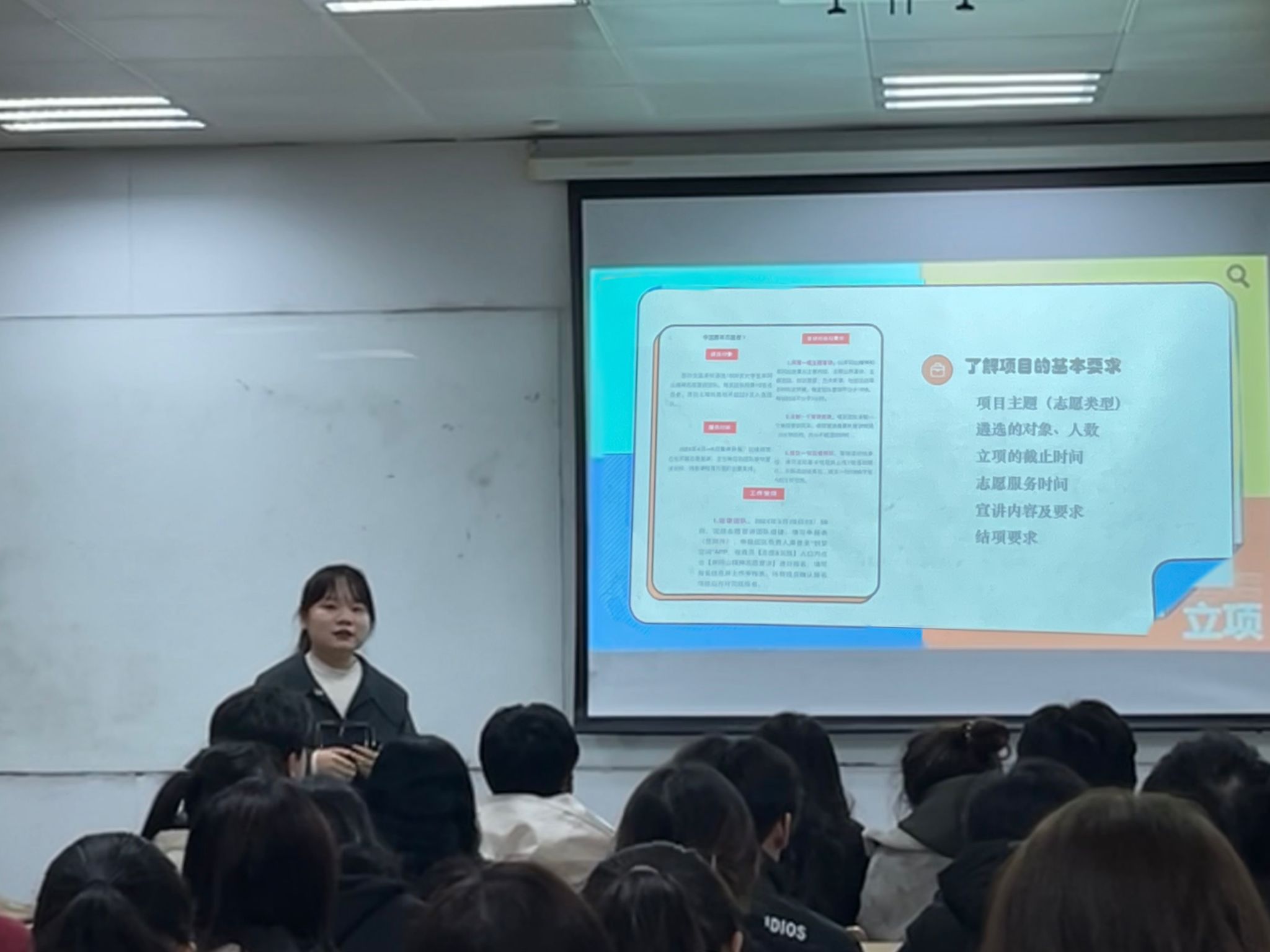 为深入学习宣传贯彻习近平新时代中国特色社会主义思想和党的二十大精神,落实“强国复兴有我”群众性主题宣传教育活动相关要求,争做有理想、敢担当、能吃苦、肯奋斗的新时代好青年,我院团委按照相关要求,鼓励学子积极申报团中央各项专项项目,组织开展志愿服务团队立项讲座。