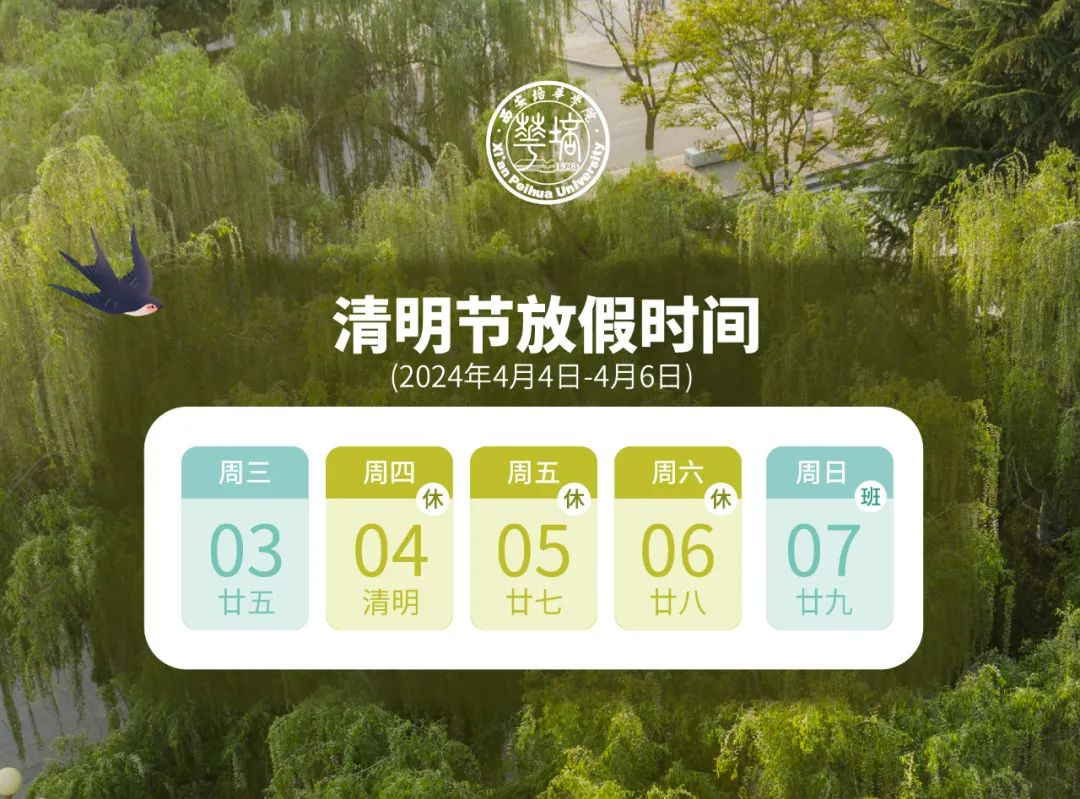 盼来人间四月天,清明假期随之而来,根据上级部门放假通知及校历安排,2024年4月4日(星期四)至6日(星期六)放假调休,共3天。4月7日(星期日)正常上班,执行星期四的教学计划。