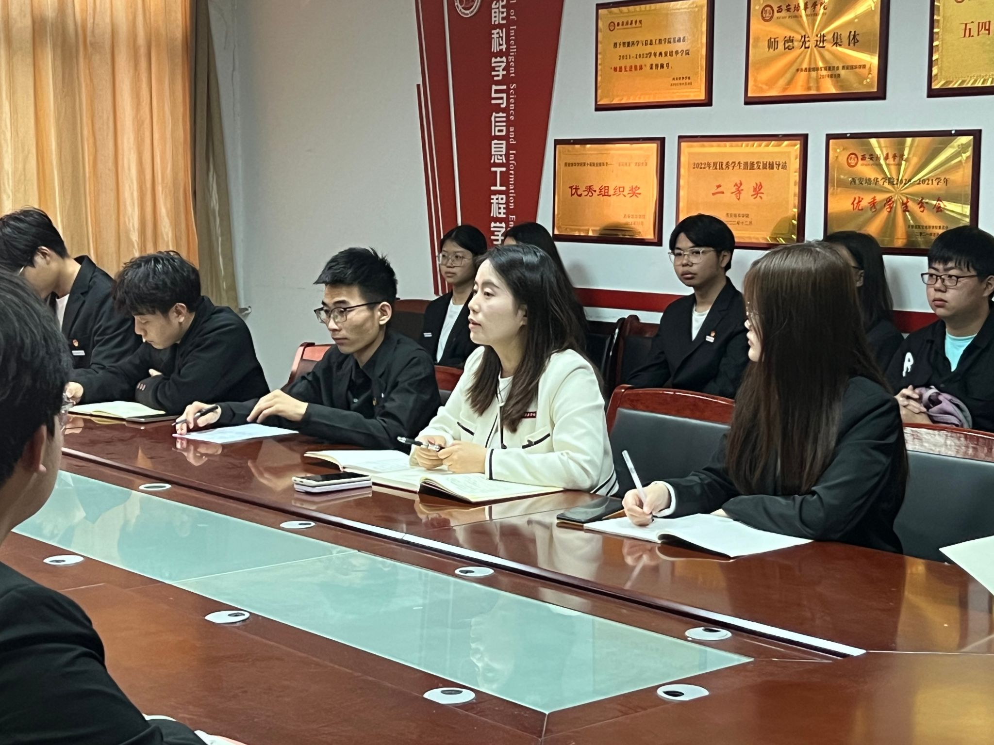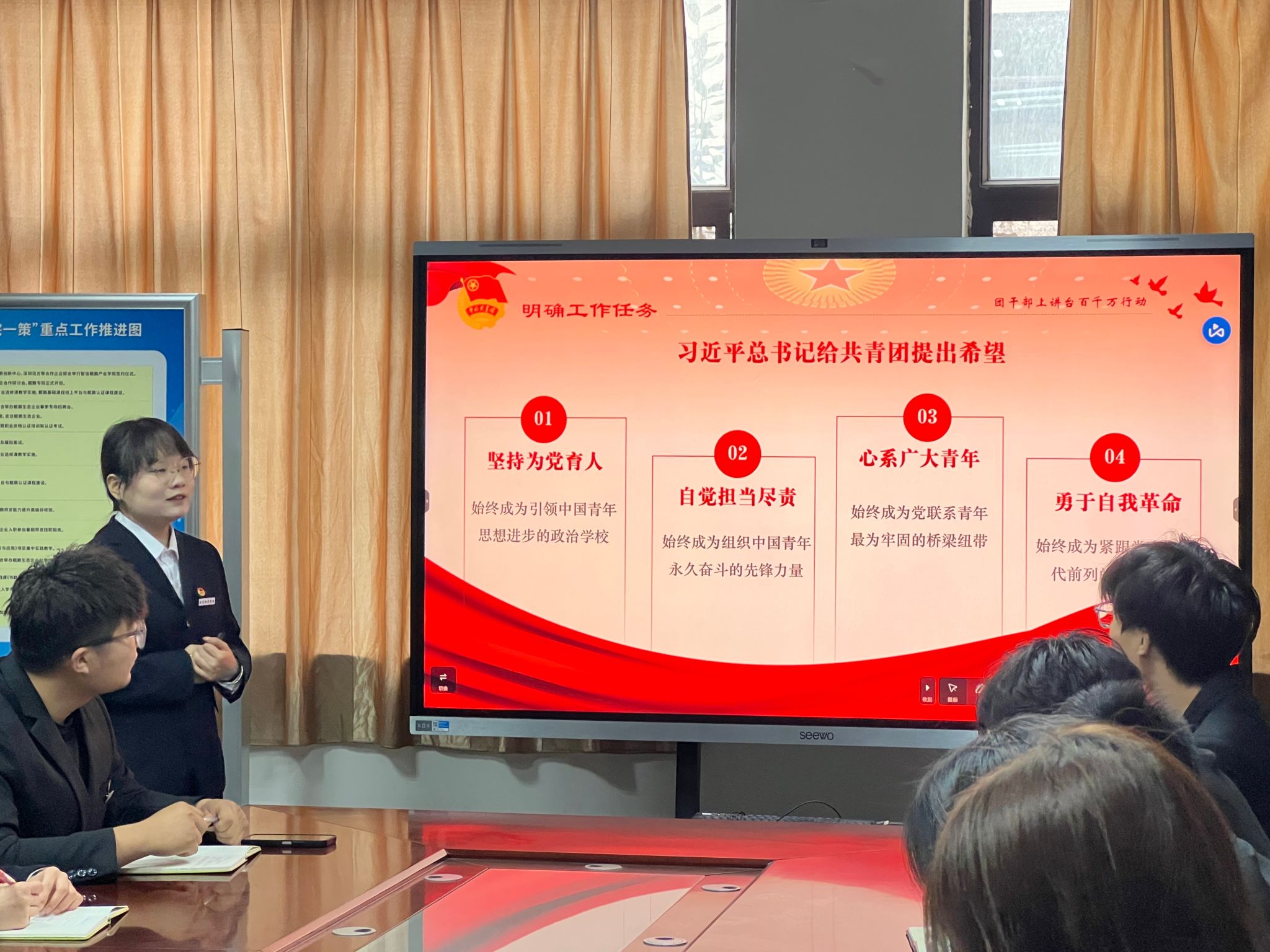 在追溯建团一百周年的历史时,她同团干部们一起回忆中国青年在四个历史阶段的不懈奋斗,坚定不移跟党走的初心使命,同时向团干部们明晰新时代青年要如何奋斗,结合习近平总书记给共青团所提出的希望,鼓励团干部们做有理想、敢担当、能吃苦、肯奋斗的新时代好青年,引导广大团员在校期间找到进步的方向,树立远大志向,将自我价值的实现与国家发展、社会进步结合起来。