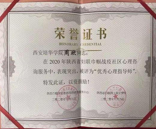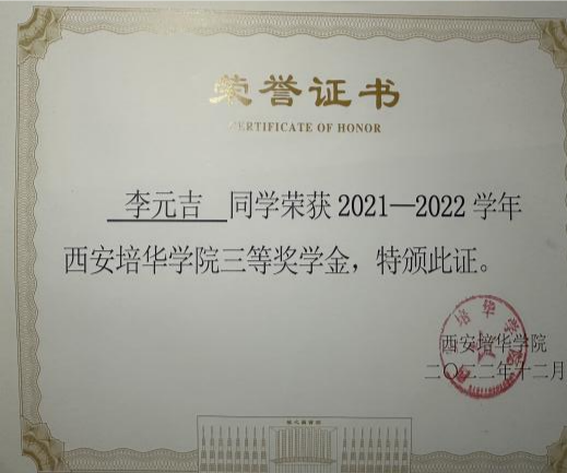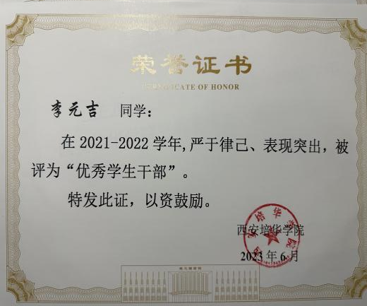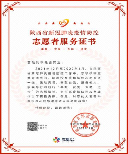 2021年冬天,李元吉同学带领全班39位同学积极加入我院抗疫志愿服务队,主动加入校园疫情防控核酸检测及公寓日常值班队伍,为校园疫情防控助力451小时,彰显了培华青年党员的担当和奉献精神,获得陕西省新冠肺炎疫情防控“优秀志愿者”、西安培华学院“优秀志愿者”荣誉证书。