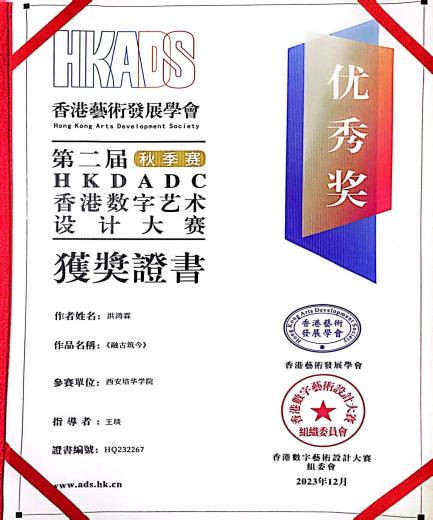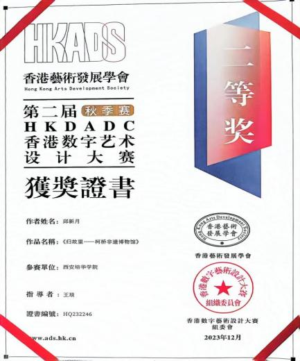 在校期间他还获得了多项荣誉,其中包括团支书述职大会三等奖、名花有主求职大赛一等奖、第六届国青杯艺术设计大赛二等奖、西安培华学院二等奖学金、三好学生和2023年“五育并举”活动先进个人荣誉称号。