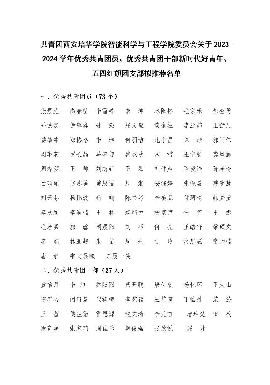 根据《西安培华学院关于评选2023—2024学年优秀共青团员、优秀共青团干部、新时代好青年、五四红旗团支部和五四红旗团委的通知》的相关要求,结合各支部的实际情况,经学生个人(支部)申请、团支部民主评议并推荐、学院团委组织审核、秉持“公平 公开 公正”原则,经学院联评,现将智能科学与工程学院2023-2024学年优秀共青团员、优秀共青团干部、新时代好青年、五四红旗团支部拟推荐名单予以公示。