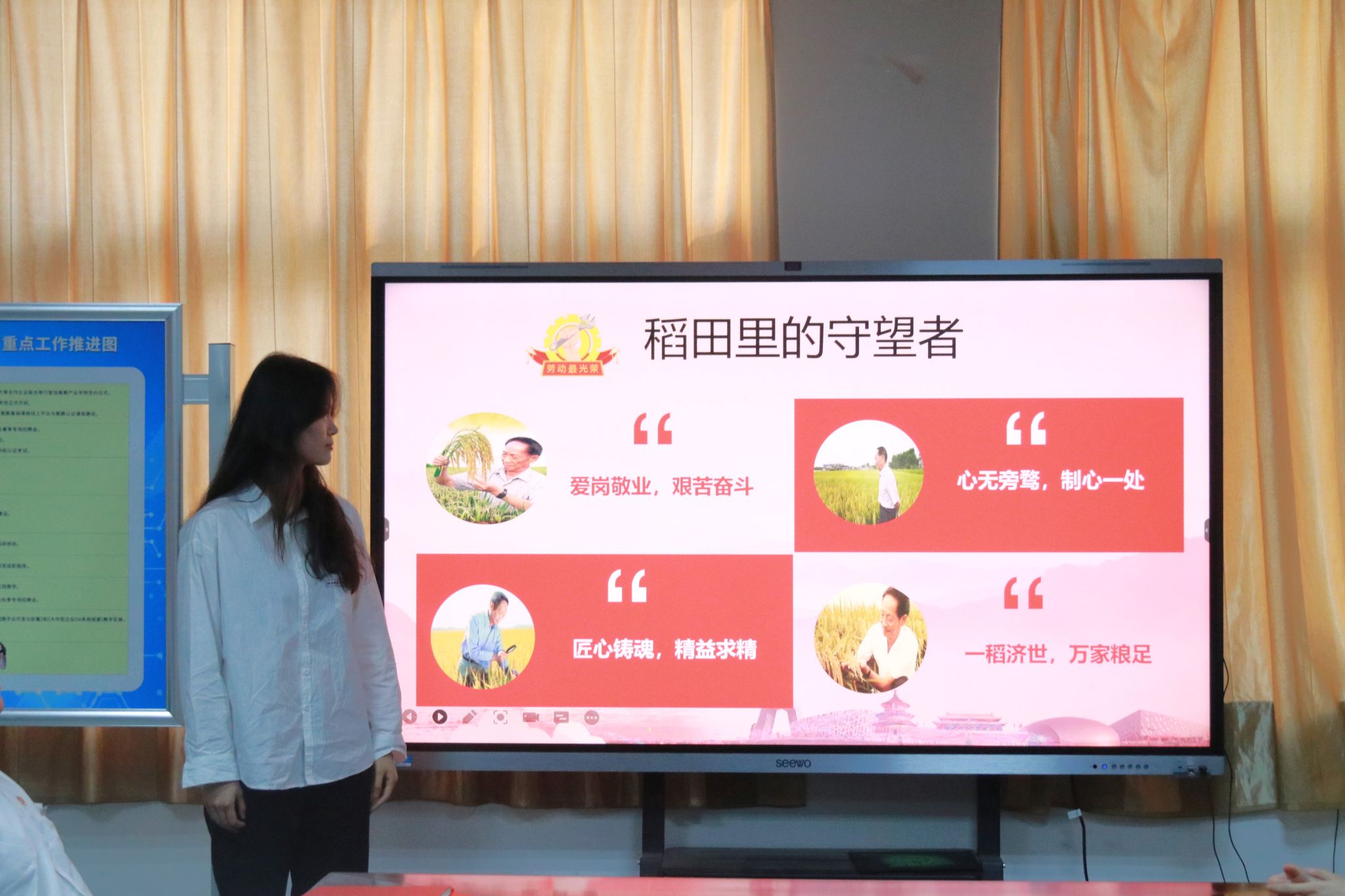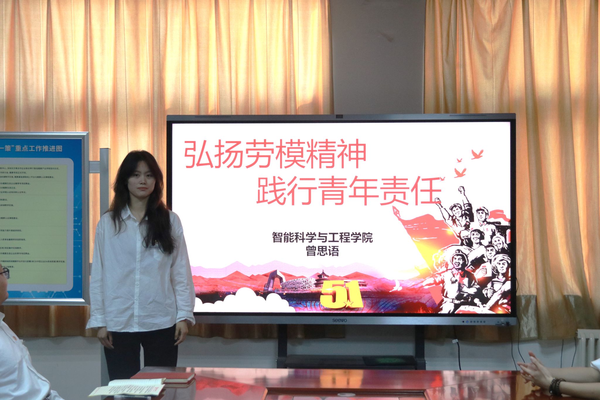 2023计算机科学与技术02班团支部曾思语同学带着大家从“中国第一刀”的火药雕刻王徐立平走到第一位从湘钢走出来的焊接大师艾爱国,再到“水稻之父”袁隆平院士研发籼型水稻一步步摸索,为大家阐述了劳模精神的意义,随后又将视野拉回我们自身,告诉了团员青年们如何传承发扬劳模精神精神,同时引导着广大团员在校期间找到进步的方向,树立远大志向,将自我价值的实现与国家发展、社会进步结合起来,成为走在新时代前列的新青年。