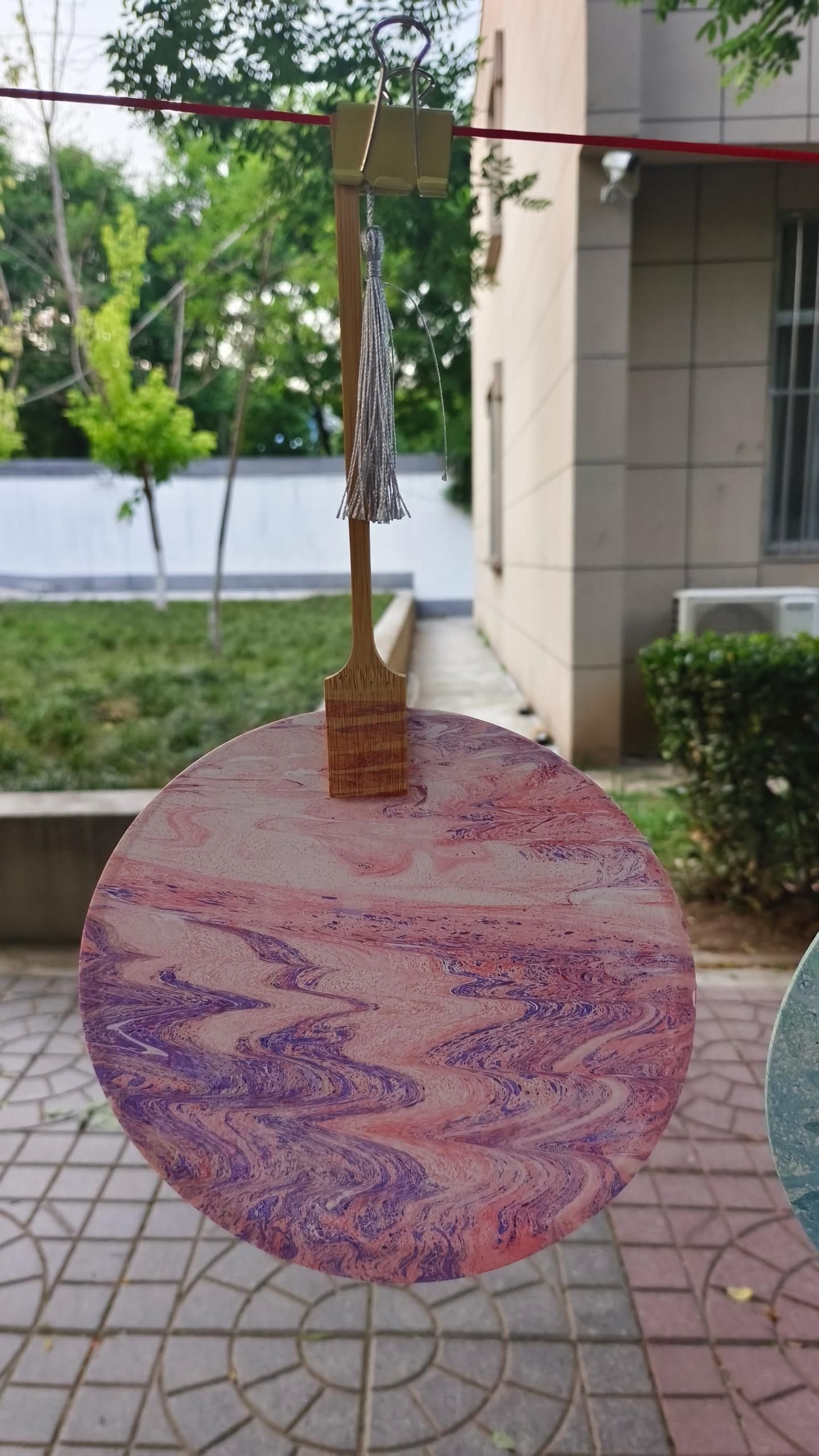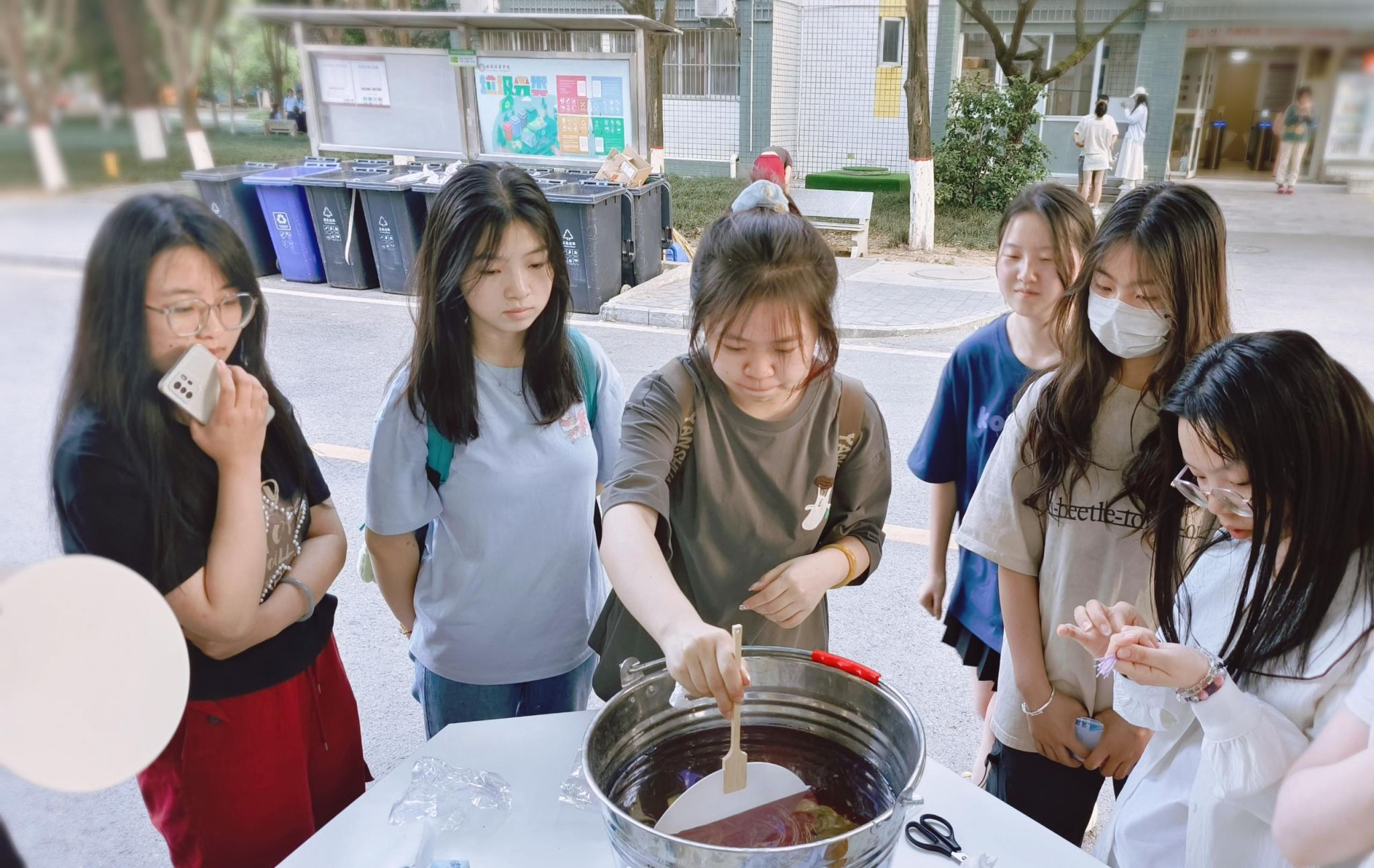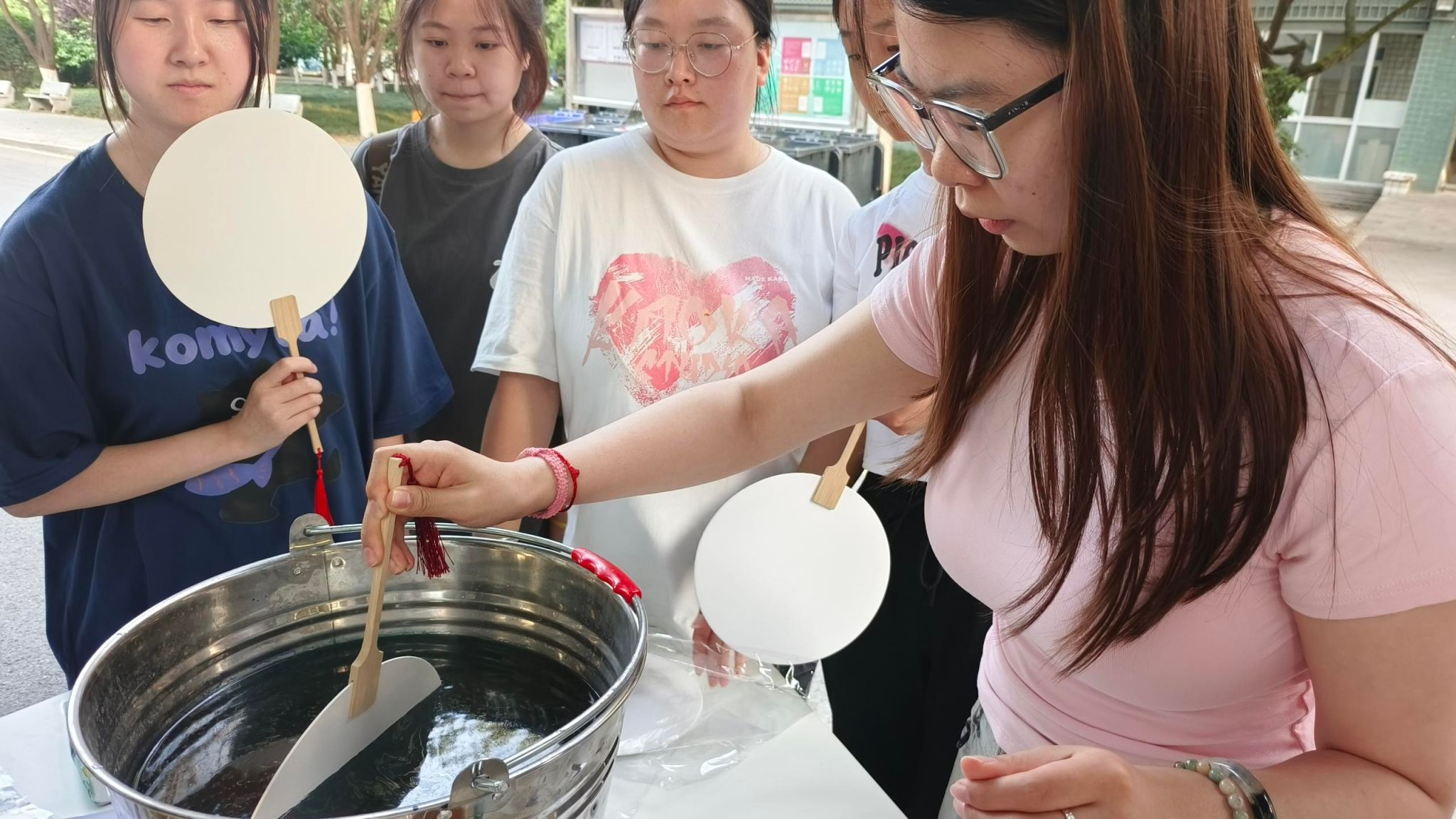 接着,指导老师现场演示了漂漆扇的制作过程。熟练地调色、滴水、旋转扇面,一连串的动作如行云流水般自然。在指导老师的引导下,大学生们纷纷动手尝试,他们或是细心调色,或是轻轻旋转扇面,每个人的脸上都洋溢着专注与喜悦。