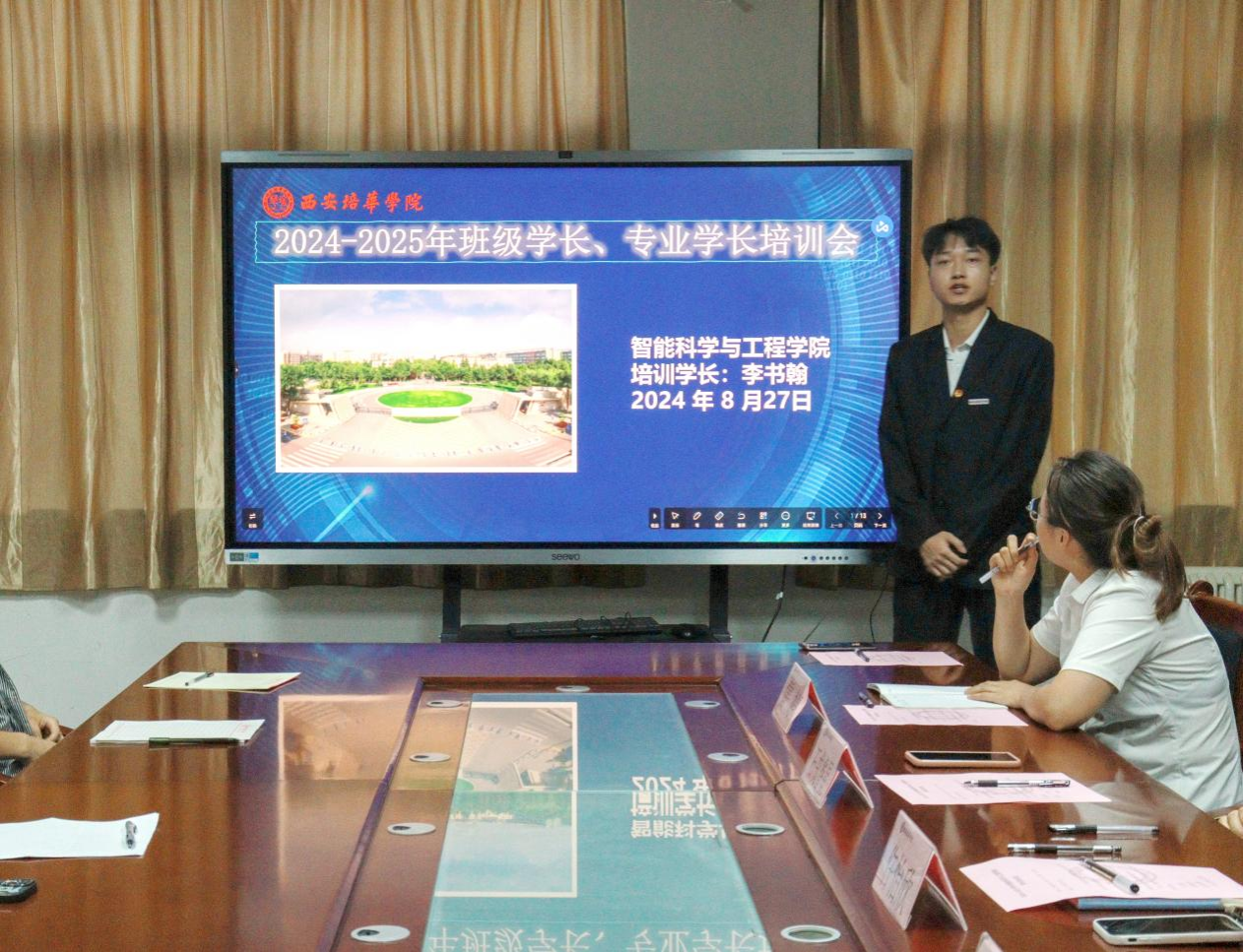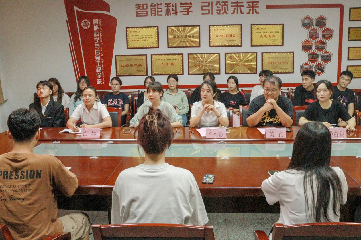 为了做好2024级新生迎接及入学教育工作,让新生尽快熟悉和了解学校和学院,适应大学生活,进一步发挥新生学长朋辈引领作用,智能科学与工程学院于2024年8月27日在党员会议室召开2024级学长培训会。出席本次会议的有团委书记仵怡欣老师、新生辅导员石戎睿星老师、雷婷老师、黄鑫老师和范静毅老师,2023级学长代表以及全体2024级新生学长。