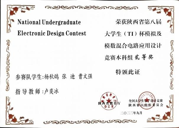 她指导学生参加陕西省第八届大学生(TI)杯模拟及模数混合电路应用设计竞赛获得二等奖,指导学生参加第九届中国国际“互联网+”大学生创新创业大赛获得优秀奖,指导学生参加2023年全国大学生电子设计竞赛陕西赛区获得三等奖。指导暑期“三下乡”社会实践学生团队拍摄短视频《鬼谷故里和光伏大道》荣获西安培华学院“九十五载培华情 同心共筑培华梦”短视频大赛乡村振兴赛道一等奖,个人荣获“优秀指导老师”荣誉称号。