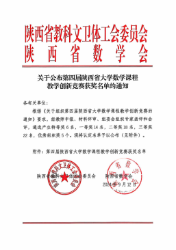 2024 年 9 月 20 日,根据陕西省教科文卫体工会委员会、陕西省数学学会发布的第四届陕西省大学数学课程教学创新竞赛获奖文件获知,我校智能科学与工程学院基础系数学教研室邢瑞芳副教授斩获竞赛一等奖,我校为同类院校唯一获得一等奖的院校。
