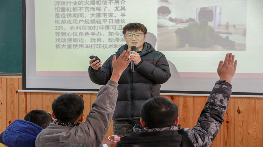 梁越同学带领学生体验3D打印技术与游戏手柄,同时讲解其中所运用的原理,使得孩子们能够通过简单的编程,实现手柄与游戏之间的互动,激发孩子们对科技的兴趣,培养他们的创新思维和实践能力。