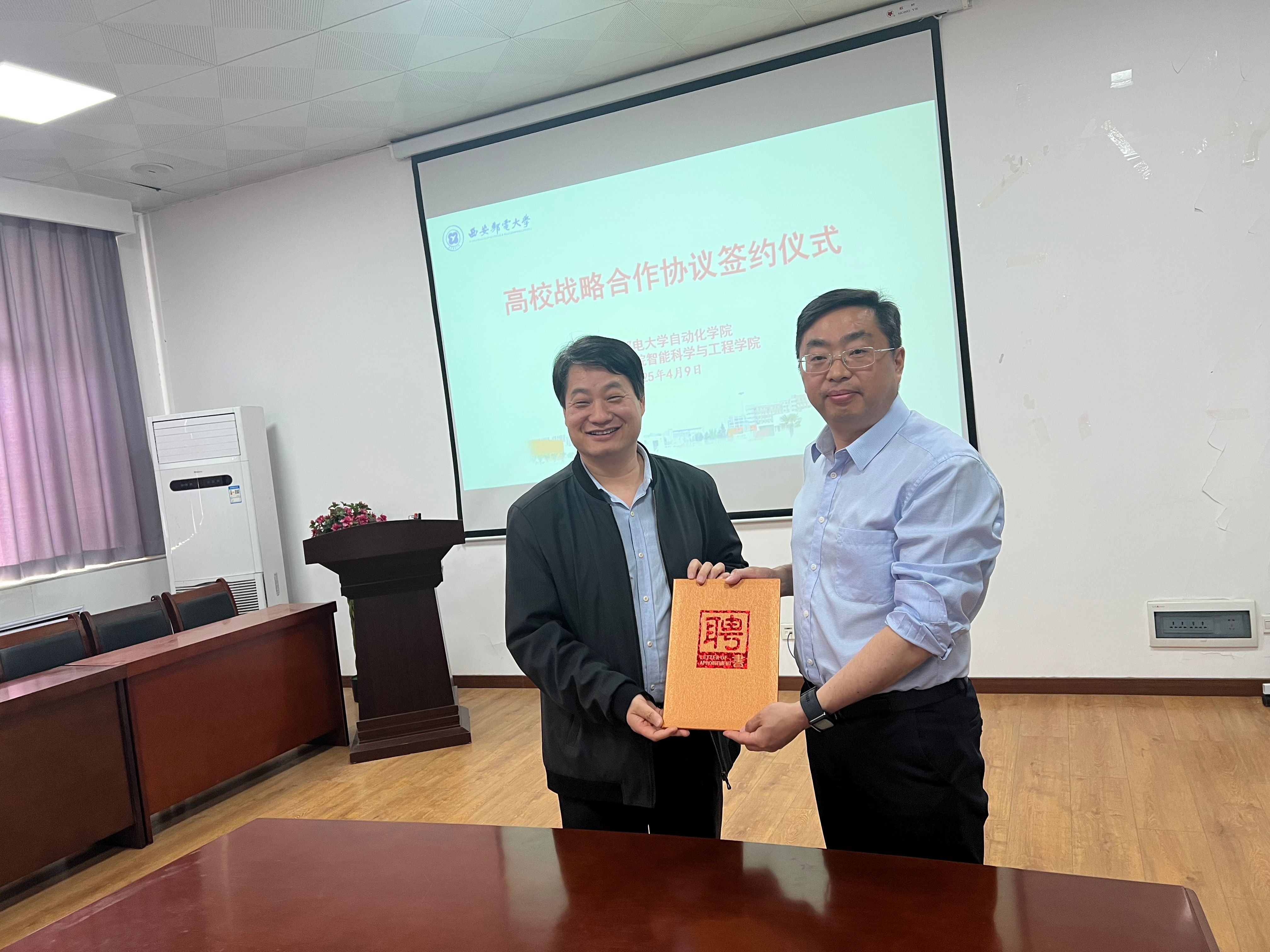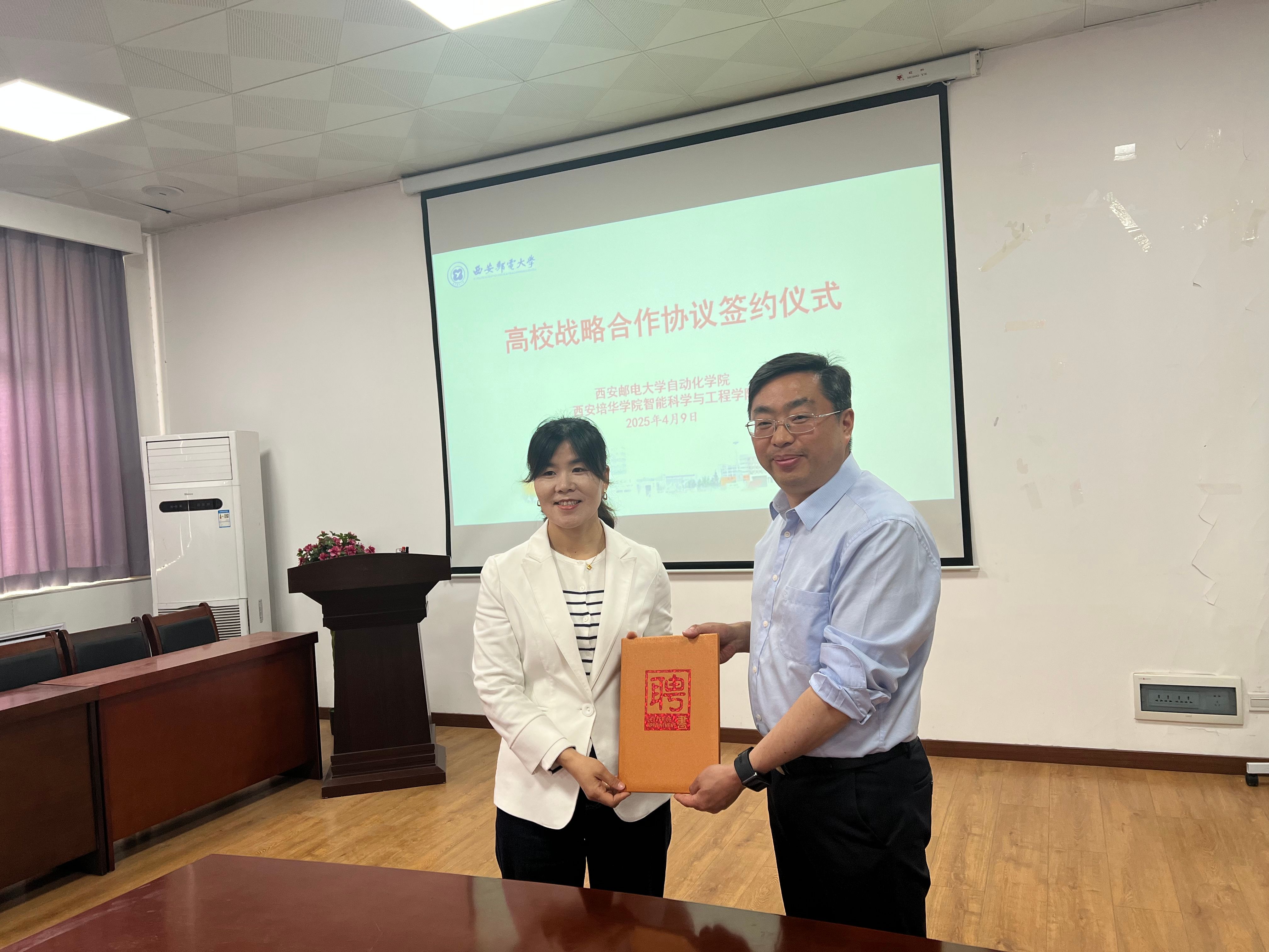 签约仪式后,西安邮电大学自动化学院院长赵峰向西安培华学院的教师代表颁发硕士研究生指导教师聘书,这标志着西安培华学院的教师正式成为西安邮电大学自动化学院的硕士研究生导师,将共同参与研究生的培养工作。