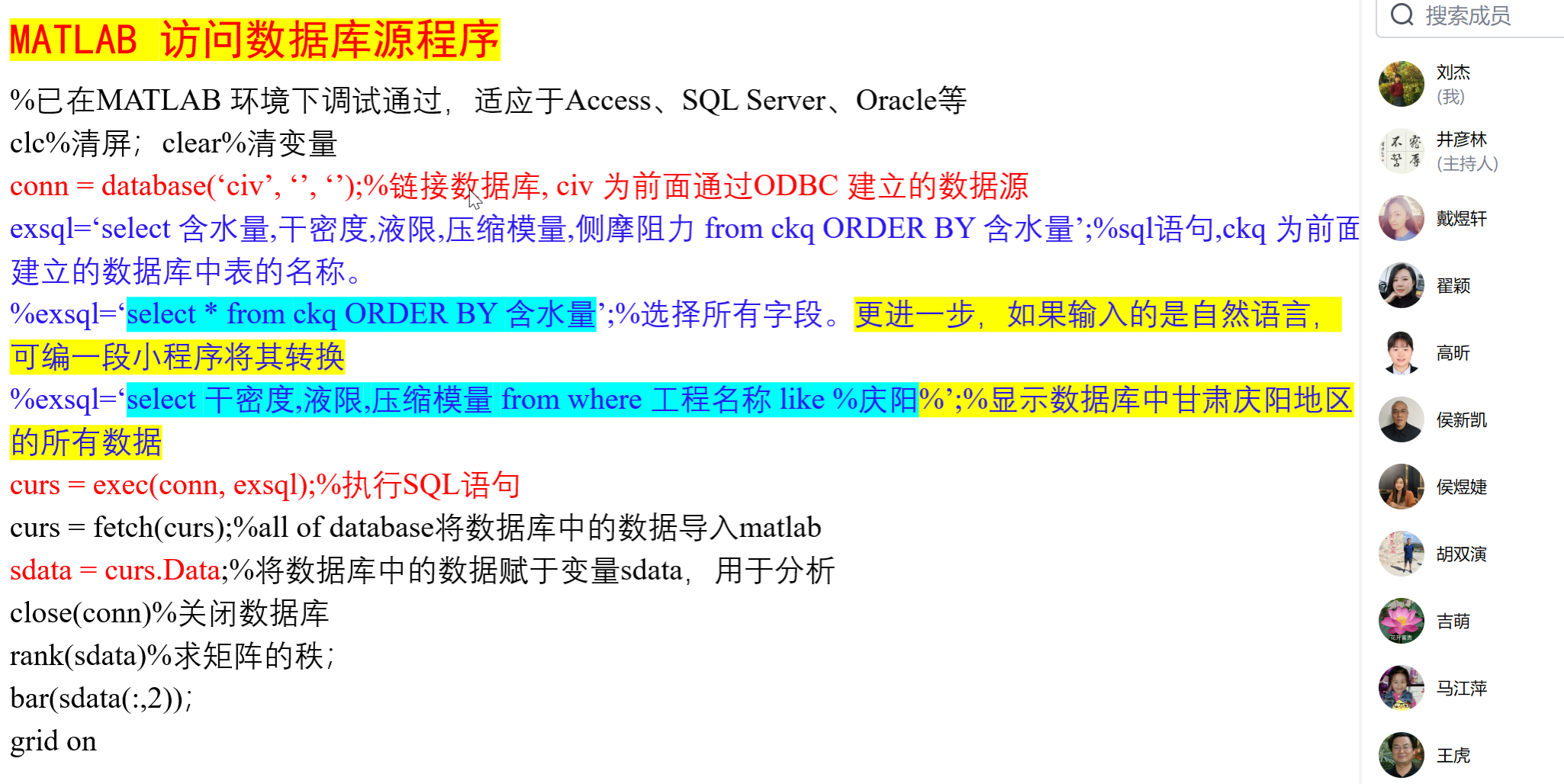 针对实际工程需求,井教授特别演示了以下关键技术:ODBC桥梁搭建:通过配置64位ODBC数据源,实现MATLAB与Access数据库的无缝连接;SQL语言应用:结合Access的查询设计功能,现场编写并运行SQL语句,完成数据检索与处理。与此同时,进行工程案例分享,以“黄土力学数据库查询系统”开发为例,剖析了多表查询、条件筛选等功能的实现逻辑,并强调了软硬件环境(如64位系统、固态硬盘)对数据处理效率的影响。