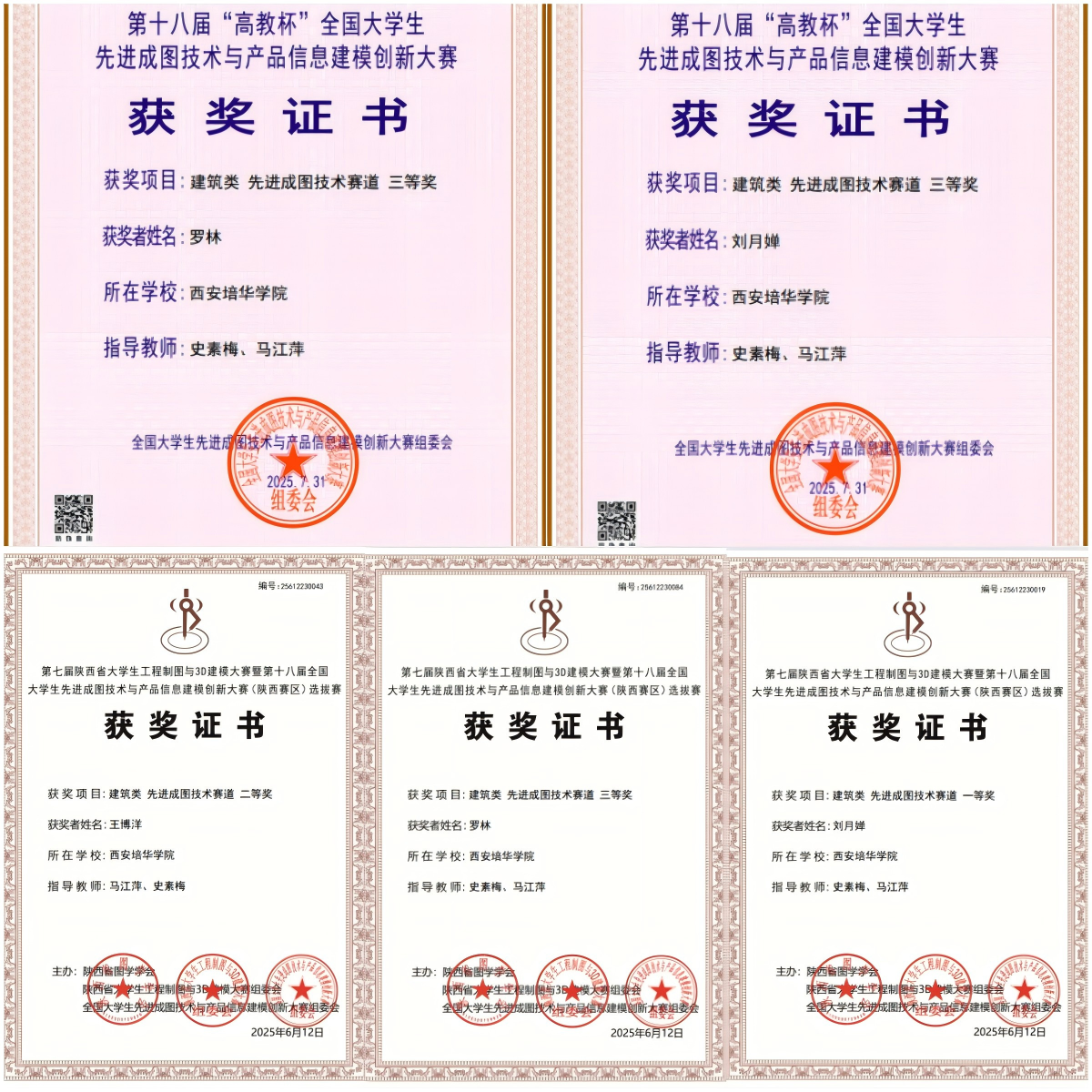近日,第十八届“高教杯”全国大学生先进成图技术与产品信息建模创新大赛总决赛在太原理工大学圆满落幕。西安培华学院智能科学与工程学院组织的参赛队伍经过激烈角逐斩获建筑类5个奖项。其中,在7月25至28日的国赛中获先进成图技术赛道个人三等奖2项;在5月23至25日的省赛中获先进成图赛道赛道个人一等奖1项、二等奖1项、三等奖1项的佳绩。