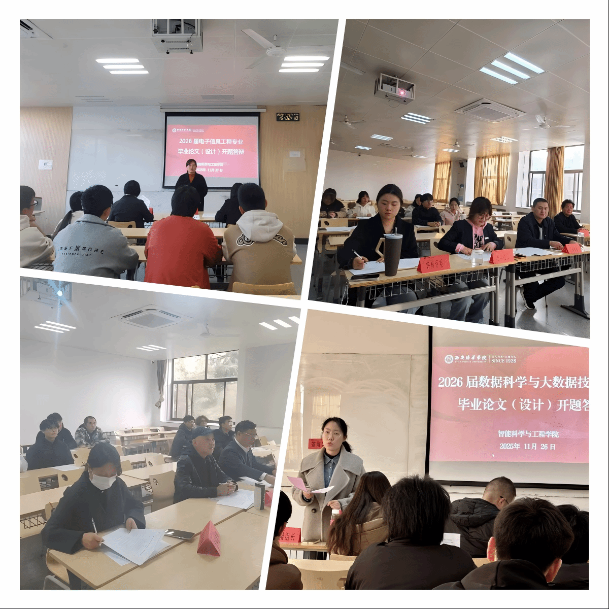 本科毕业论文(设计)是检验学生综合运用专业知识、开展学术研究与实践创新的核心环节,也是深化教学改革、提升人才培养质量的重要抓手。为严格落实《关于做好2026届本科毕业论文(设计)开题工作的通知》要求,智能科学与工程学院以审核评估为契机,以质量提升为导向,于2025年11月24日至11月28日顺利完成2026届毕业论文(设计)开题答辩工作。本次答辩通过强化组织领导、严格过程管理、深化专家指导,为毕业生学术研究的规范性、创新性与可行性筑牢根基。