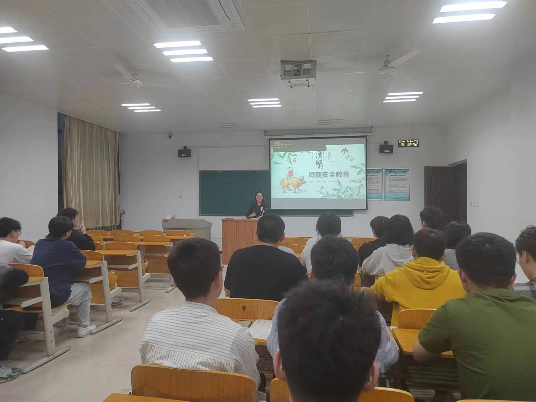 放假前,辅导员以主题班会等形式,对所有学生进行全面的安全教育。包括人身财产安全、网络安全、健康安全、交通安全、消防安全、食品安全等方面的知识。尤其是清明节外出时,通过正规渠道购买车票,不乘坐无证无牌及超载车辆,提高自身安全防范意识。