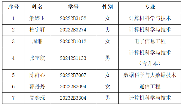 经学生个人申请、院学生资助工作小组初审及公开答辩等环节,最终拟推荐柏宇轩等7名同学作为智能科学与工程学院2024-2025学年国家奖学金候选人,现将名单予以公示(排名不分先后):